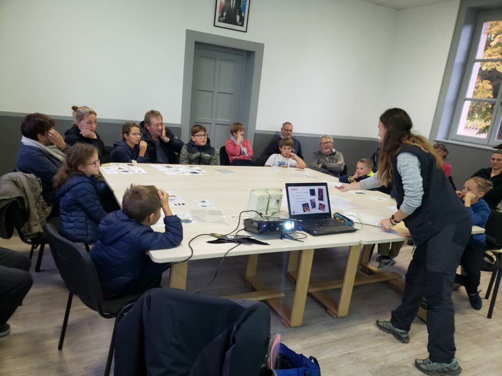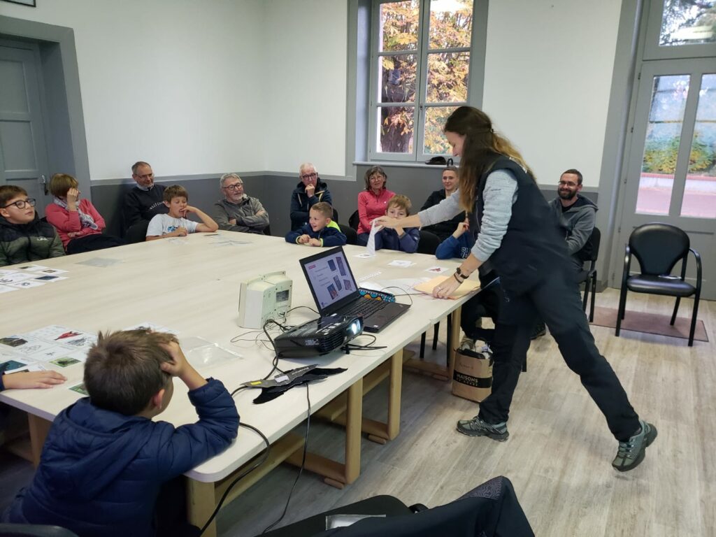Il y a eu une partie théorique en salle et une partie en extérieur lors de laquelle le public a pu observer et écouter différentes espèces de chauves-souris grâce à un appareil captant les ultrasons.